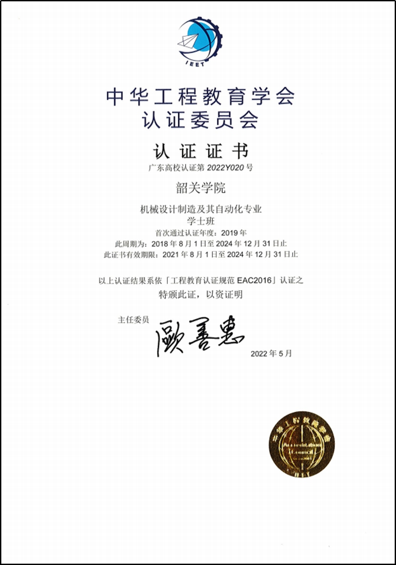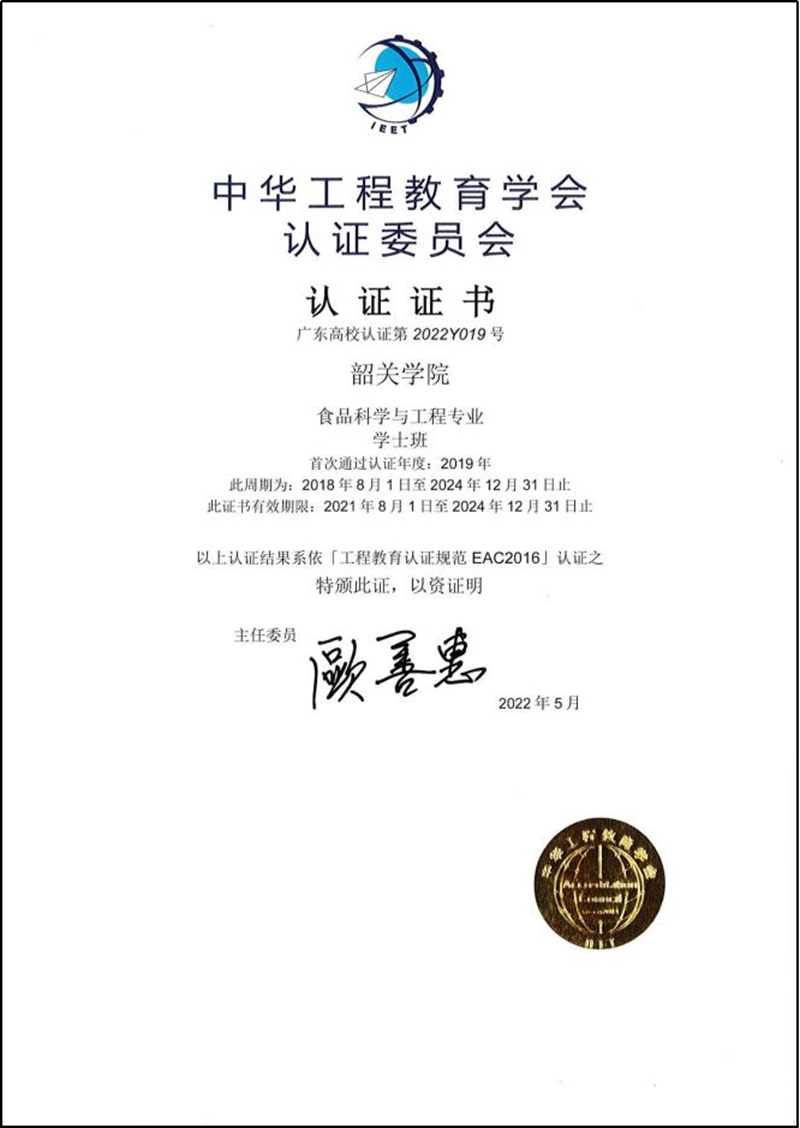 近日,我校机械设计制造及其自动化、食品科学与工程专业2个专业通过了国际认证机构中华工程教育学会认证委员会(以下简称IEET)认证期中审查,获得IEET认证证书,有效期为2021年8月1日至2024年12月31日。