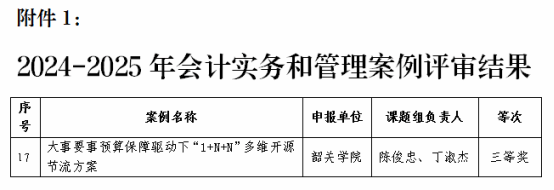 2025年5月,在广东省教育会计学会“教育会计实务优秀案例”征集评选活动中,财务部陈俊忠部长撰写的《大事要事预算保障驱动下“1+N+N”多维开源节流方案》荣获三等奖,展现了我校在财务管理领域的探索成效。