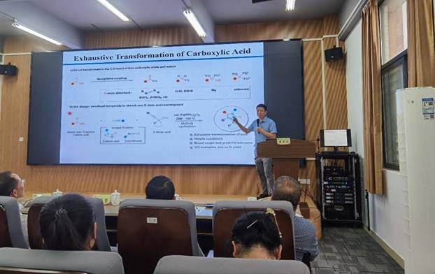 黄良斌作了题为“过渡金属催化β-消除与羧酸的转化”的学术报告,总结了其近几年利用过渡金属催化与β-消除策略实现羧酸的多功能转化原创性工作及其在药物功能性成分增效修饰改性方面的可行性探索。李建晓作了题为“绿色化学导向的炔烃高效转化反应研究”的学术报告,总结了其近年来在钯催化炔烃与烯烃的偶联反应和钯催化炔烃的官能团化反应的创新研究,新的研究解决了合成小环内酯和噁唑杂环化合物在常规合成中步骤繁冗、催化效率低、污染严重等关键性问题,丰富了有机合成方法学和绿色化学的内涵。
