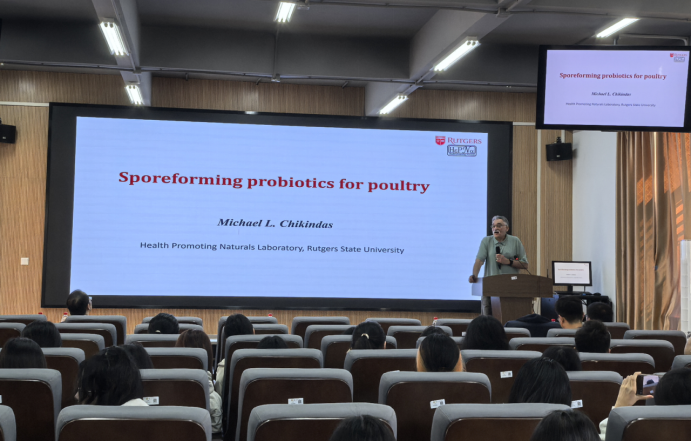 Michael Leonidas Chikindas教授作题为“芽孢益生菌在禽类养殖中的应用”的报告。他围绕芽孢益生菌的特性,详解其替代抗生素后,在提升家禽生长速度、改善蛋品质,以及降低养殖中氧化应激与炎症风险等方面的作用机制,为禽类无抗养殖提供了新思路。