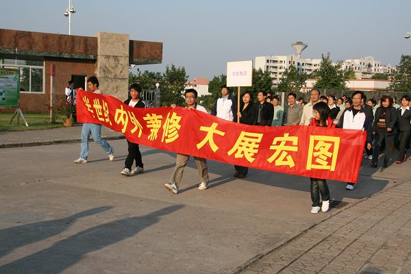 下午4时10分,朝晖广场上旗帜招展,教职工队伍前“五十载,上下求索,跨越发展;半世纪,内外兼修,大展宏图”标语尤为醒目。校党委副书记许俊杰宣布:“韶关学院教职工迎校庆环校健步行活动开始!”教职工在学校领导的带领下,迈着矫健的步伐走出广场,健步行活动沿着图书馆前的文渊路向西行,绕东湖、西湖一圈后回到朝晖广场,大约行程2公里。