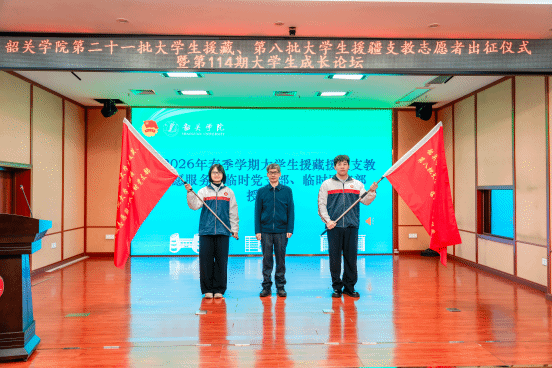 仪式上,张晓红为2026年春季学期援藏援疆支教志愿服务队授队旗,邓惠毅为支教服务队临时党支部、临时团支部授旗。