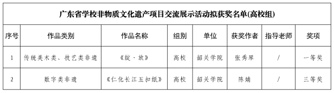 近日,由省教育厅主办的广东省学校非物质文化遗产项目交流展示活动圆满落幕。我校在此次交流展示活动中获一等奖1项、三等奖1项,体现了学校在非遗传承教学中的具体成效。