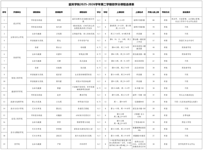 为进一步落实OBE教育理念,完善学校应用型人才培养体系,将第二课堂纳入人才培养体系一体化管理,根据《韶关学院微学分管理办法(试行)》(韶教院〔2024〕27号),学校将在本学期陆续开设一批注重实践体验、能在学校重大活动和各类比赛竞赛中实现成果展示运用的微学分课程,现将2025-2026学年第二学期微学分课程学生选课的有关事项作以下通知: