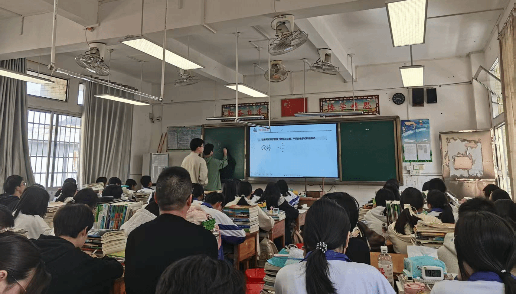 首先,学院领导带队深入乐昌二中教学一线,听取了我院实习生讲授的公开课。实习生以扎实的专业知识、生动的教学设计和良好的课堂互动展现了扎实的教学基本功,获得了在场师生的高度认可。随后,双方领导、老师以及实习生开展了座谈会。在座谈会上,实习驻点教师曾宪标从教学能力提升、班级管理实践、师德师风建设等方面汇报了实习生前期工作情况。乐昌二中领导和老师充分肯定了实习生的专业素养和敬业精神,特别提到实习生在实验教学、分层辅导等环节的创新表现,并对学院实习指导工作提出宝贵建议。实习生代表结合自身经历,分享了实习中的收获与感悟,表示将珍惜机会,努力成长为“站稳讲台、扎根教育”的优秀教师。