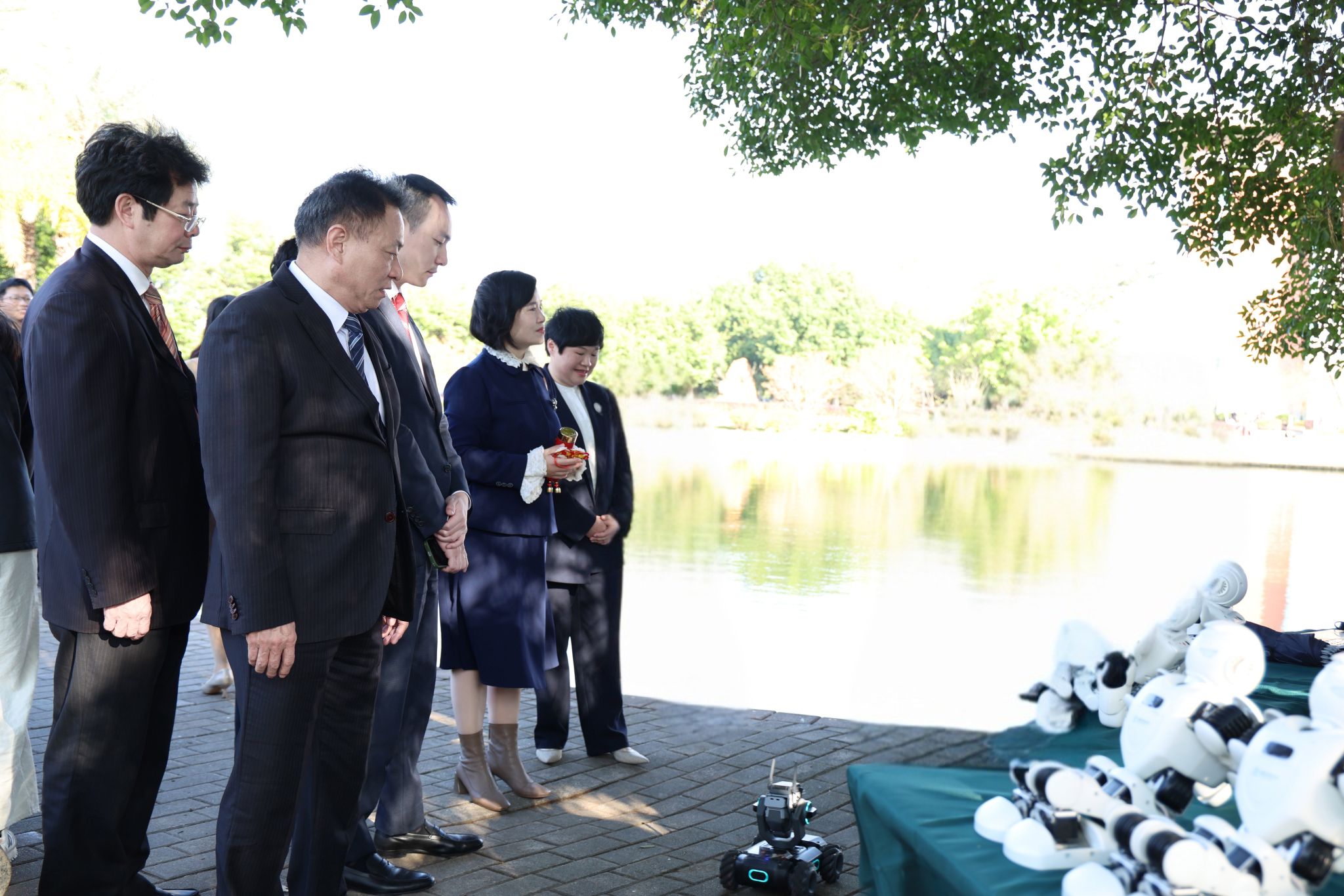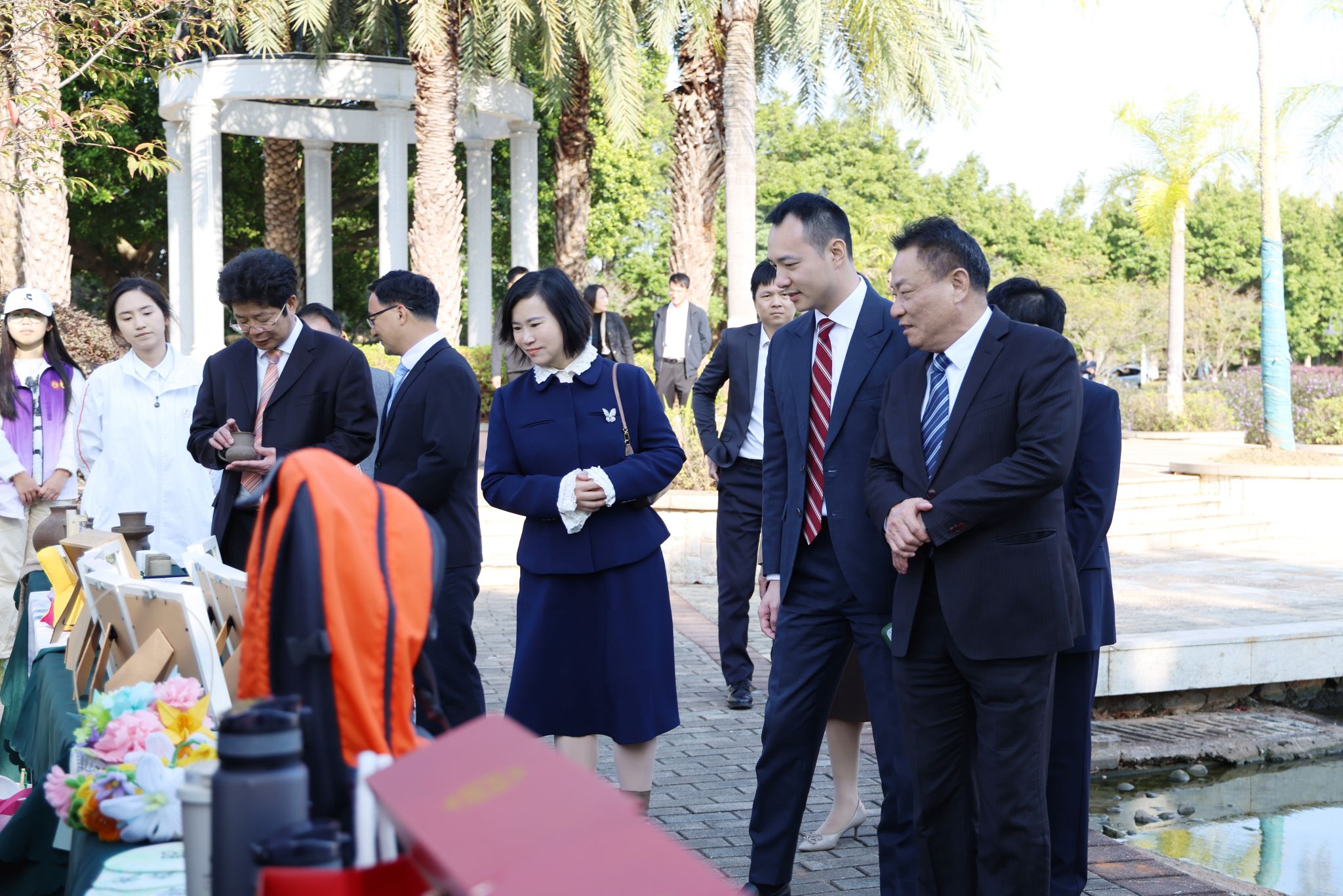 在英东樱花园与霍公亭,霍启文了解校园规划建设,参观大学生多维素质成果展示,了解学校产学研融合的实践成果。
