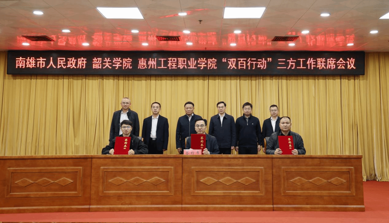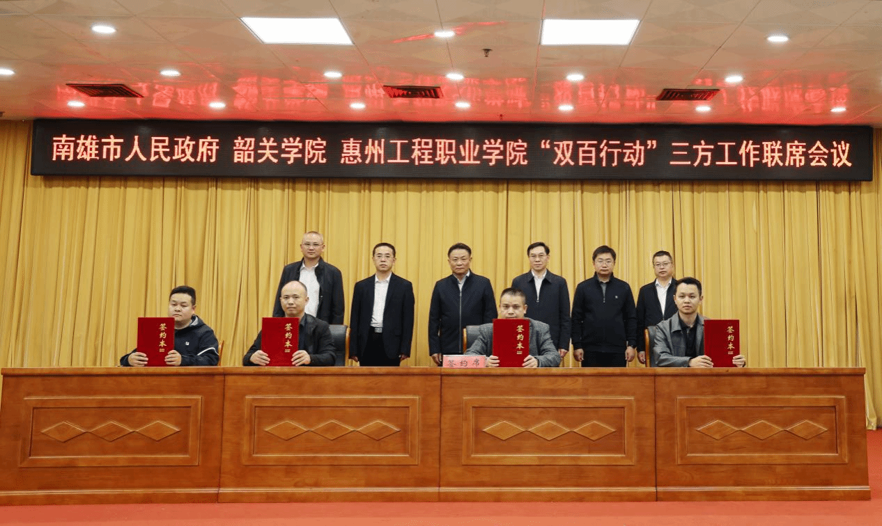 正值广东实现“百千万工程”三年初见成效目标的重要节点,恰逢韶关学院、惠州工程职业学院与南雄市人民政府结对共建的三周年,12月11日下午,韶关学院、惠州工程职业学院与南雄市人民政府在南雄市举行“双百行动”2025年第二次三方工作联席会议,全面总结2023-2025年共建南雄“双百行动”工作成效,并对下一阶段任务进行再部署、再推动、再落实。南雄市市长陈冰、市委副书记雷伟,韶关学院党委书记孔云龙、党委副书记吴善添,惠州工程职业学院党委书记孙立武,韶关市“百千万工程”指挥部“双百行动”专班办公室副主任李国全等出席会议。会议由南雄市委常委、统战部部长杨耀轩主持。