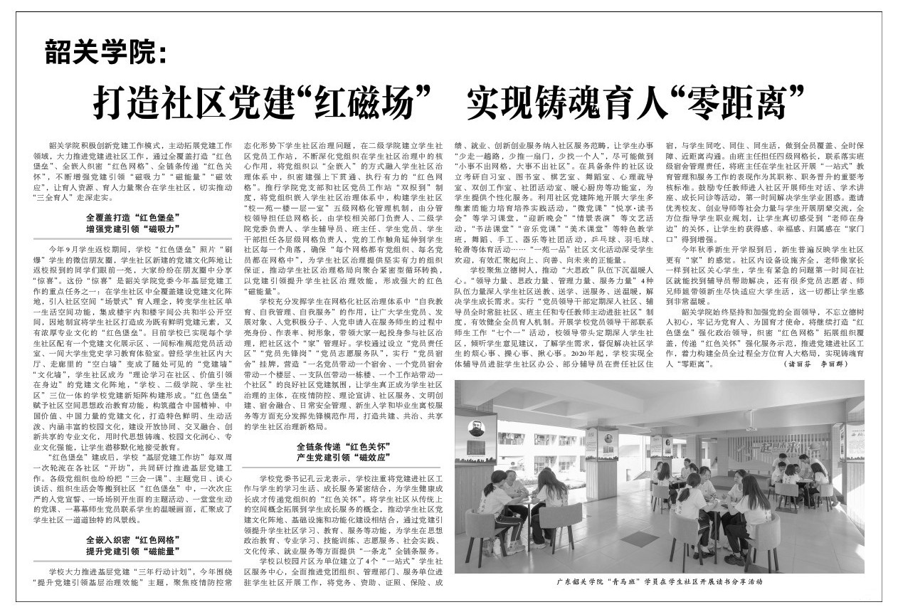 在喜迎党的二十大胜利召开之际,《光明日报》在今天半版刊发我校党建工作经验文章——《韶关学院:打造社区党建“红磁场” 实现铸魂育人“零距离”》。 文章围绕学校如何落实立德树人根本任务,积极创新党建工作模式,主动拓展党建工作领域,大力推进党建进社区工作,通过全覆盖打造“红色堡垒”、全嵌入织密“红色网格”、全链条传递“红色关怀”,不断增强党建引领“磁吸力”“磁能量”“磁效应”,让育人资源、育人力量聚合在学生社区,着力构建全员全过程全方位育人大格局,实现铸魂育人“零距离”。