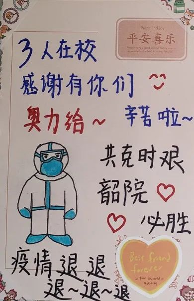 这些天,老师和志愿者们真是辛苦了!我感受到了很多温暖:你们做核酸时的认真细致、配送三餐的准时,每一天都一如既往的严谨,令我十分感动。谢谢你们!
