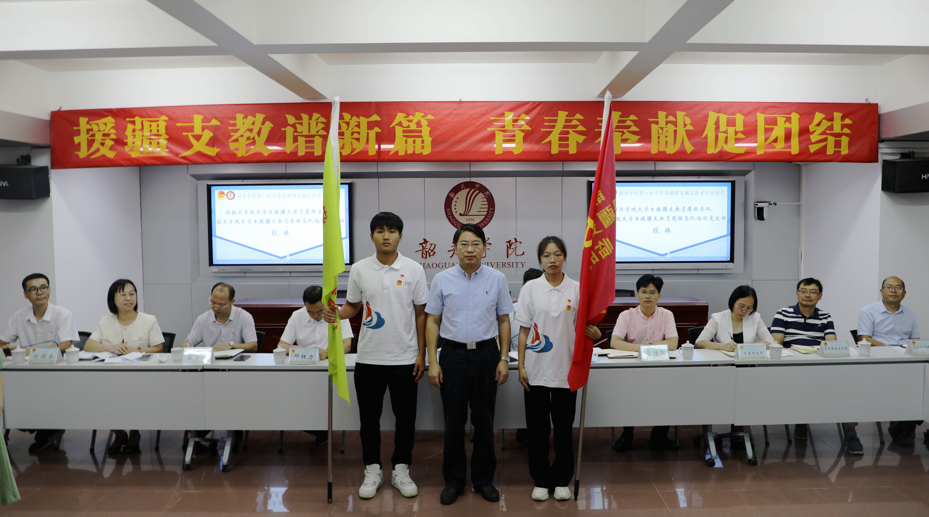 为进一步做好援疆支教工作,学校成立韶关学院第一批大学生援疆支教志愿服务队,同时,为进一步发挥党员的先锋模范作用和党支部的战斗堡垒作用,学校在党员志愿者中成立大学生援疆支教志愿服务队临时党支部。廖益分别为支教志愿服务队和服务队临时党支部授旗。