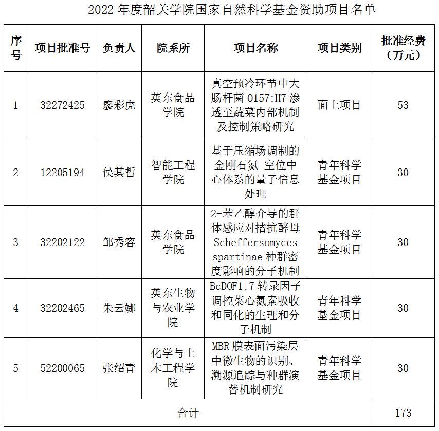 近日,2022年度国家自然科学基金项目申请评审结果公布,我校5个项目获立项资助(面上项目1项、青年科学基金4项,具体立项名单详见附表),批准经费173万元,获批国家自然科学基金项目类型和立项经费与前几年相比稳中有进,为学校提升办学层次,实现高质量发展奠定了良好的基础。