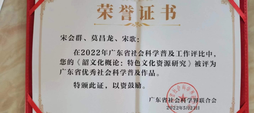 近日,广东省社会科学界联合会发文并颁发证书,表彰2022年广东省优秀社会科学普及作品,我校宋会群、莫昌龙等撰写出版的《韶文化概论:特色文化资源研究》获评为"2022年广东省优秀社会科学普及作品",全省共有19件作品获评该奖项,我校是第一次获此省级殊荣。