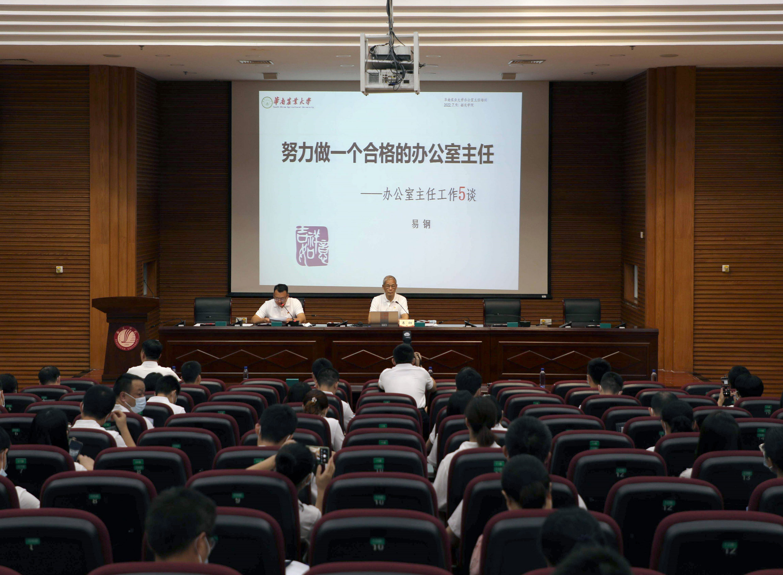 培训邀请了华南农业大学原党委办公室主任易钢研究员作了题为《努力做一名合格的办公室主任——办公室主任工作5谈》讲座,围绕办公室主任工作的特点、工作的性质、文字功底、素质要求、主要收获等五方面为大家讲述如何努力做一个合格的办公室主任。易钢的讲座内容丰富,信息量大,既有案例分析,又有理论省思,得到了大家的认可。