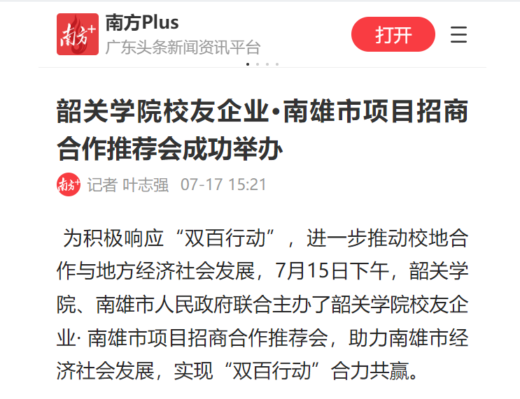为积极响应“双百行动”,进一步推动校地合作与地方经济社会发展,7月15日下午,韶关学院、南雄市人民政府联合主办了韶关学院校友企业· 南雄市项目招商合作推荐会,助力南雄市经济社会发展,实现“双百行动”合力共赢。