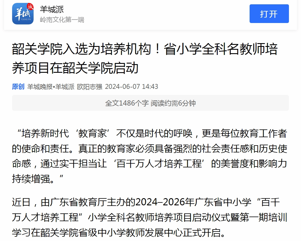 近日,由广东省教育厅主办的2024–2026年广东省中小学“百千万人才培养工程”小学全科名教师培养项目启动仪式暨第一期培训学习在韶关学院省级中小学教师发展中心正式开启。