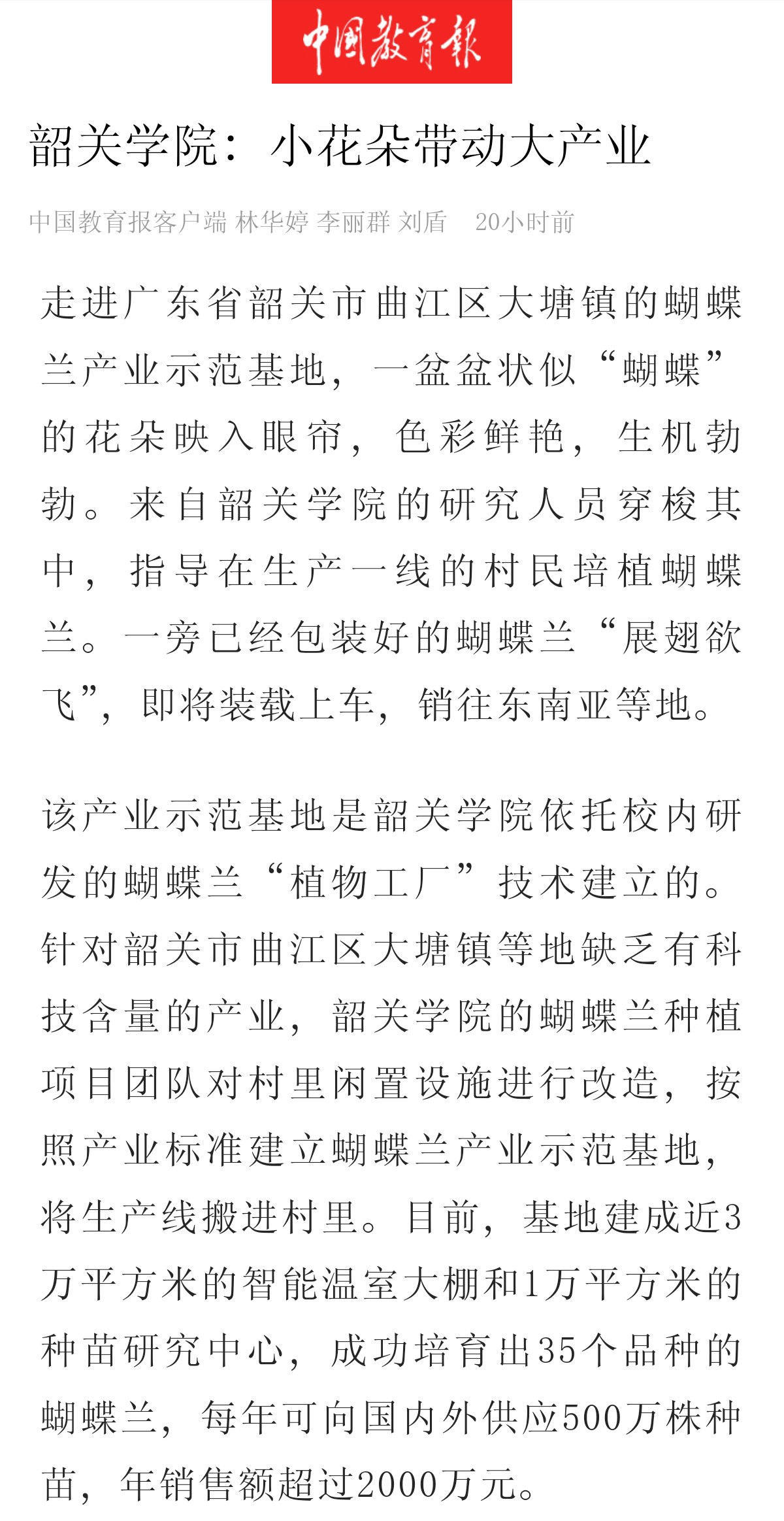 目前,韶关学院蝴蝶兰产业示范基地已经形成一整套完整的研发、组培、栽培、催化和销售体系。基地已申请和授权国家发明专项4项,实用新型专利13项,并成功注册“韶兰”“韶州兰花”商标。依托大湾区交易平台,基地的蝴蝶兰逐步走出国门,先后销往东南亚、欧洲等地区。