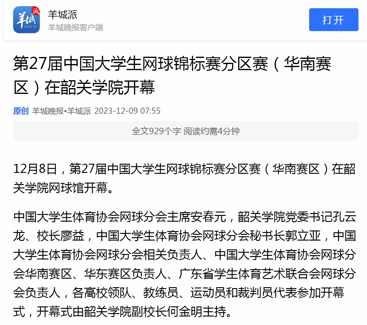 12月8日,第27届中国大学生网球锦标赛分区赛(华南赛区)在韶关学院网球馆开幕。
