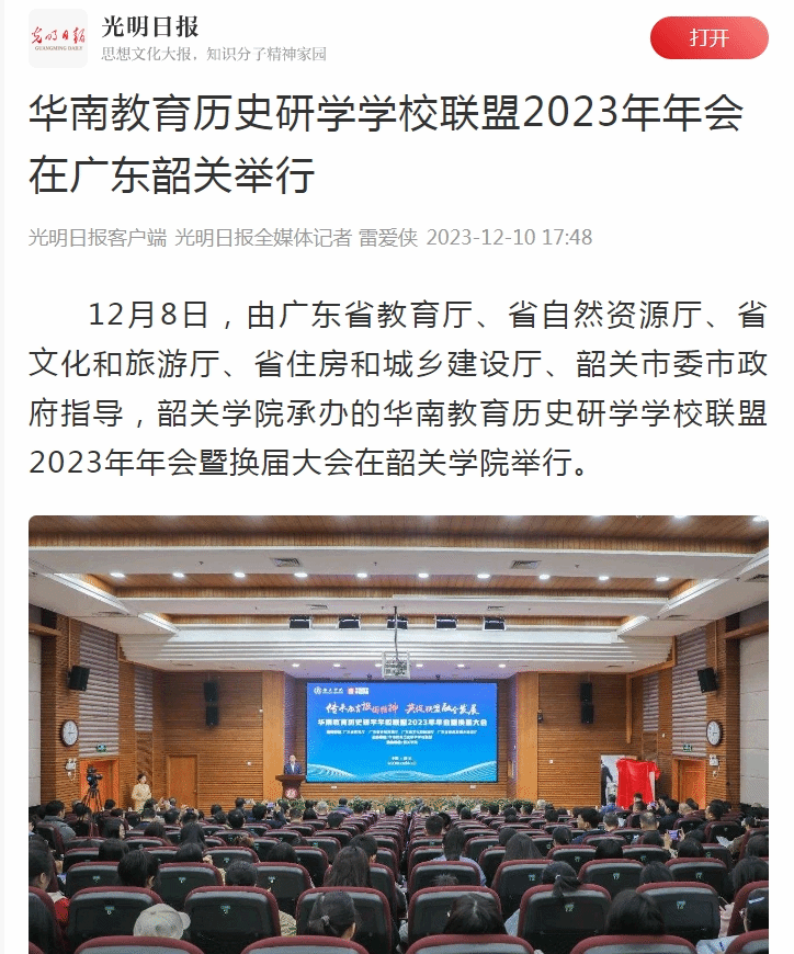 12月8日,由广东省教育厅、省自然资源厅、省文化和旅游厅、省住房和城乡建设厅、韶关市委市政府指导,韶关学院承办的华南教育历史研学学校联盟2023年年会暨换届大会在韶关学院举行。