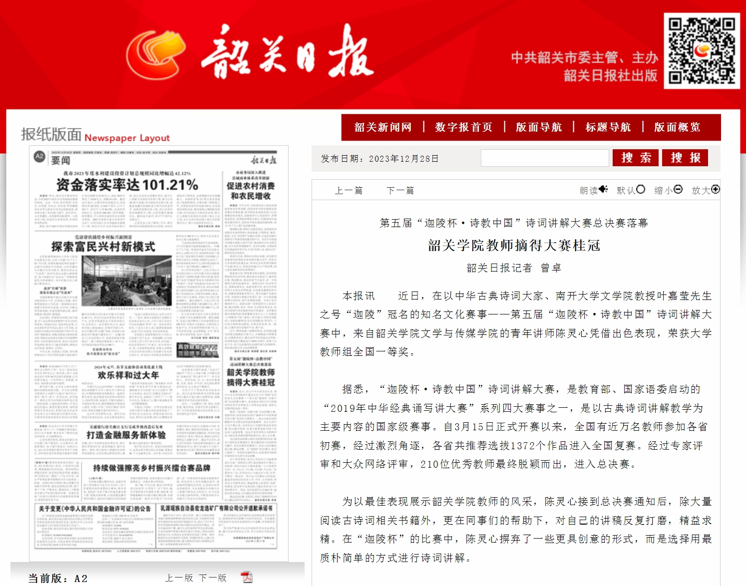 本报讯 近日,在以中华古典诗词大家、南开大学文学院教授叶嘉莹先生之号“迦陵”冠名的知名文化赛事——第五届“迦陵杯·诗教中国”诗词讲解大赛中,来自韶关学院文学与传媒学院的青年讲师陈灵心凭借出色表现,荣获大学教师组全国一等奖。