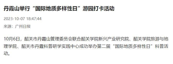 10月6日,韶关市丹霞山管理委员会联合韶关学院新兴产业研究院、韶关学院旅游与地理学院、韶关市丹霞科普研学实践中心成功举办第二届“国际地质多样性日”科普活动。