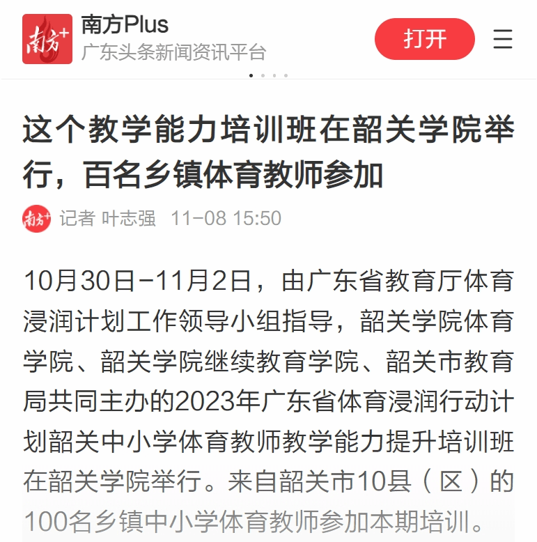 10月30日-11月2日,由广东省教育厅体育浸润计划工作领导小组指导,韶关学院体育学院、韶关学院继续教育学院、韶关市教育局共同主办的2023年广东省体育浸润行动计划韶关中小学体育教师教学能力提升培训班在韶关学院举行。来自韶关市10县(区)的100名乡镇中小学体育教师参加本期培训。