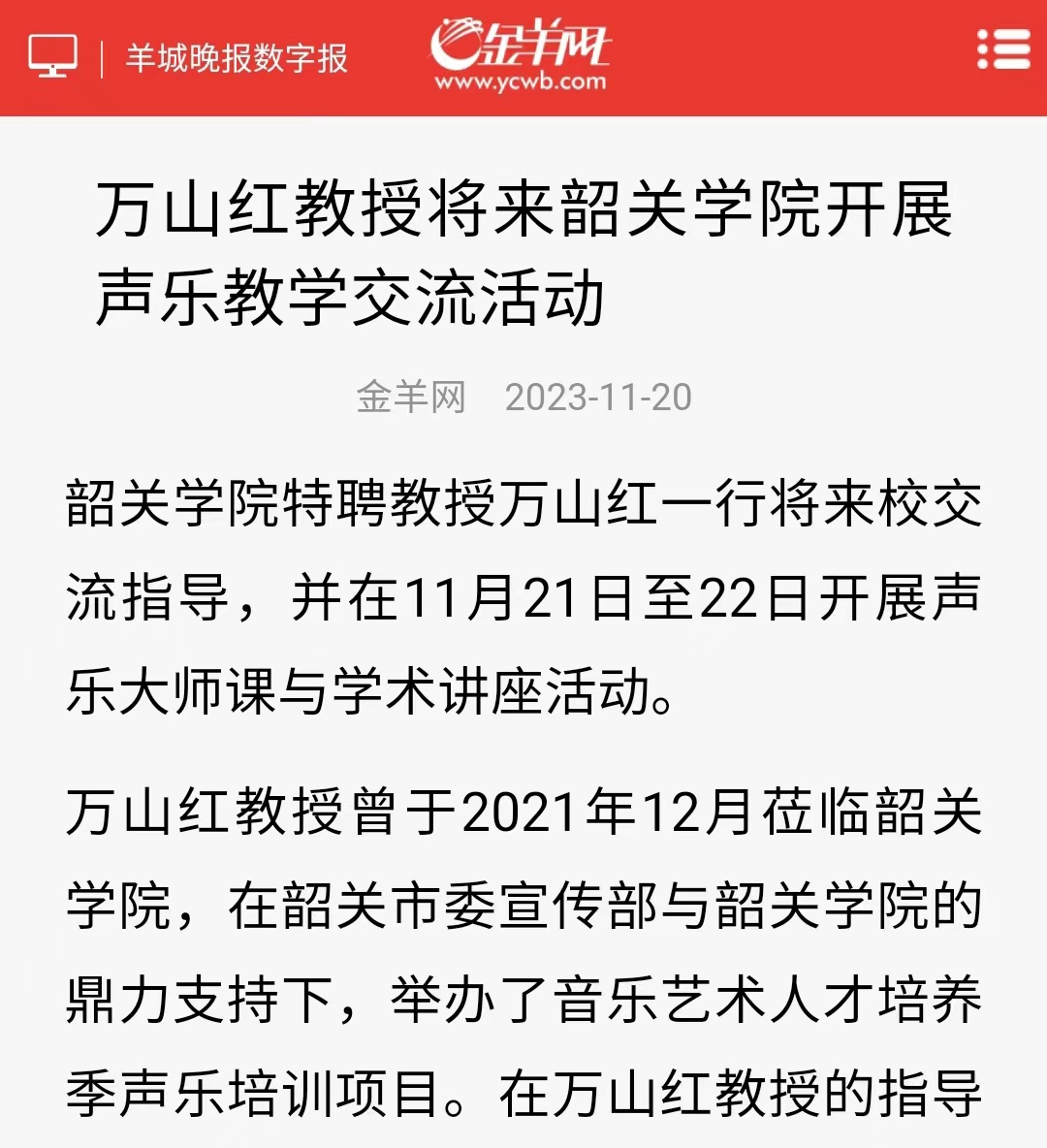 韶关学院特聘教授万山红一行将来校交流指导,并在11月21日至22日开展声乐大师课与学术讲座活动。