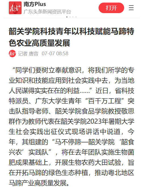 “同学们要树立奉献意识,将我们所学的专业知识和技能应用到社会实践中去,为当地人民谋得实实在在的利益……”近日,省科技特派员、广东大学生青年“百千万工程”突击队指导老师、韶关学院食品学院教授敬思群作为教师代表在韶关学院2023年暑期大学生社会实践出征仪式现场讲话中说道,今年,其组建的“马不停蹄—韶关学院‘韶食兴农’实践队”,将在去年团队实施生物菌肥成果基础上,开展生物农药大田试验,旨在开拓马蹄的绿色生态种植,推动粤北地区马蹄产业高质量发展。