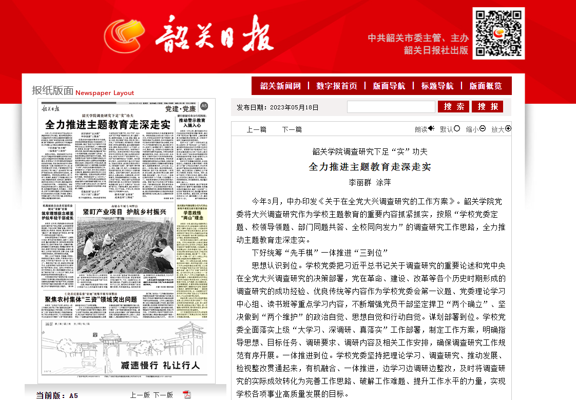 今年3月,中办印发《关于在全党大兴调查研究的工作方案》。韶关学院党委将大兴调查研究作为学校主题教育的重要内容抓紧抓实,按照“学校党委定题、校领导领题、部门同题共答、全校同向发力”的调查研究工作思路,全力推动主题教育走深走实。