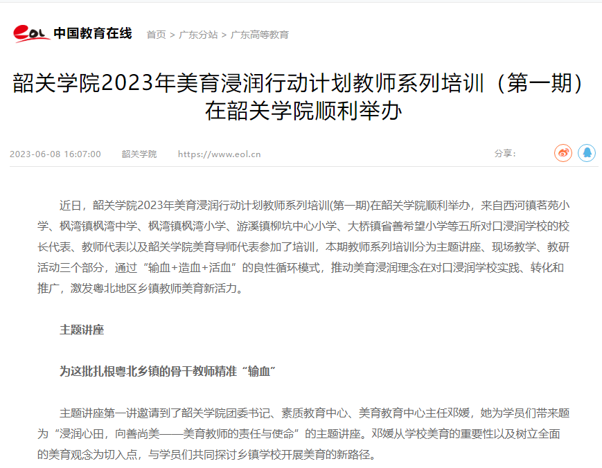 韶关学院2023年度广东省美育浸润行动计划项目负责人表示,韶关学院将继续为粤北地区中小学美育教师教学能力提升助力,定期举办教师系列培训,以对口浸润学校为点,充分利用好学校省级中小学校教师发展中心,为粤北地区中小学美育一线教师搭建好交流平台。