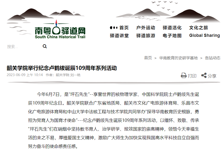 今年6月7日,是“坪石先生”--享誉世界的核物理学家、中国科学院院士卢鹤绂先生诞辰109周年纪念日。韶关学院联合广东省地质局、韶关市文化广电旅游体育局、乐昌市文化广电旅游体育局和中山大学中法核工程与技术学院共同举办“探寻华南教育历史根脉,勇担为党育人为国育才使命”---纪念卢鹤绂先生诞辰109周年系列活动,以缅怀、致敬、传承“坪石先生”们在硝烟中坚持教书育人、治学研学、报效国家的崇高精神,领悟今天幸福生活的来之不易,厚植爱国主义精神,激励广大师生为加快实现我国高水平科技自立自强而努力奋斗的使命感责任感。
