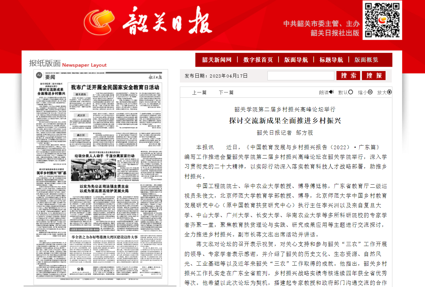 本报讯 近日,《中国教育发展与乡村振兴报告(2022)·广东篇》编写工作推进会暨韶关学院第二届乡村振兴高峰论坛在韶关学院举行,深入学习贯彻党的二十大精神,以实际行动深入落实教育科技人才战略部署,助推乡村振兴。