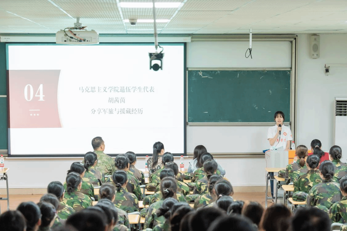 退伍复学后,胡茜茵担任军训教官,带领学生攻克队列难题;2024年,她主动请缨加入援藏支教队,担任援藏支教队队长一职。“有队友突发高反时,军营教会的‘临危不乱’让我强迫自己冷静;面对支教点的艰苦条件,抗战先烈‘百折不挠’的精神就是我的动力。”她的讲述数次被掌声打断,2025级新生军训连长何俊艺眼眶湿润:“以前总说‘青春无悔’,现在懂了,无悔的青春需要用担当和奉献去书写。”