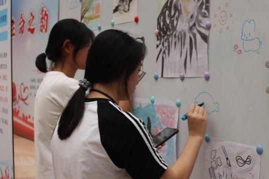现场开展了多项活动。“暖心话语墙”以画为媒,让大家在安全轻松的氛围中觉察情绪、链接内心。同学们在彩色便签上写下真挚的鼓励与祝福,传递善意、分享美好;老师们也提笔写下殷殷期许,字里行间满含对同学们的深切关怀与美好祝愿。一张张彩纸上,满是“被看见”的温暖与“我陪你”的治愈力量。
