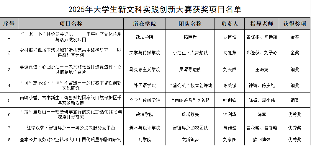 我校共有8支队伍晋级全国初赛,其中政法学院和文学与传媒学院2支队伍晋级全国总决赛,经过激烈角逐,2支队伍双双斩获全国总决赛金奖,并且在全省排名第三。金奖项目指导教师曾保根、陈诗颖、郑逸薇、刘子心获优秀指导教师;其余6支队伍分别获得3个铜奖和3个优秀奖;韶关学院获高校优秀组织单位奖,实现了我校在该项国家级赛事中的历史性突破,充分展示了我校文科专业学子扎实的专业素养、突出的创新能力和昂扬的精神风貌。