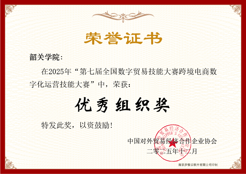 近期,第七届全国数字贸易技能大赛跨境电商数字化运营技能大赛顺利收官。本届大赛由中国对外贸易经济合作企业协会主办,共吸引全国264所院校的4437支学生队伍和384名教师参与竞赛,参赛总人数逾1.3万人。在竞争极为激烈的本科组里,共有2316支队伍、6948名选手同场竞技。经过严格评审,本科组共有一等奖99支、二等奖198支、三等奖297支。韶关学院累计荣获14项一等奖、6项二等奖、1项三等奖,总计21项奖项,一等奖获奖数量在全国本科院校中名列前茅。更值得一提的是,学校凭借出色的组织工作和优异的整体成绩,获“优秀组织奖”。