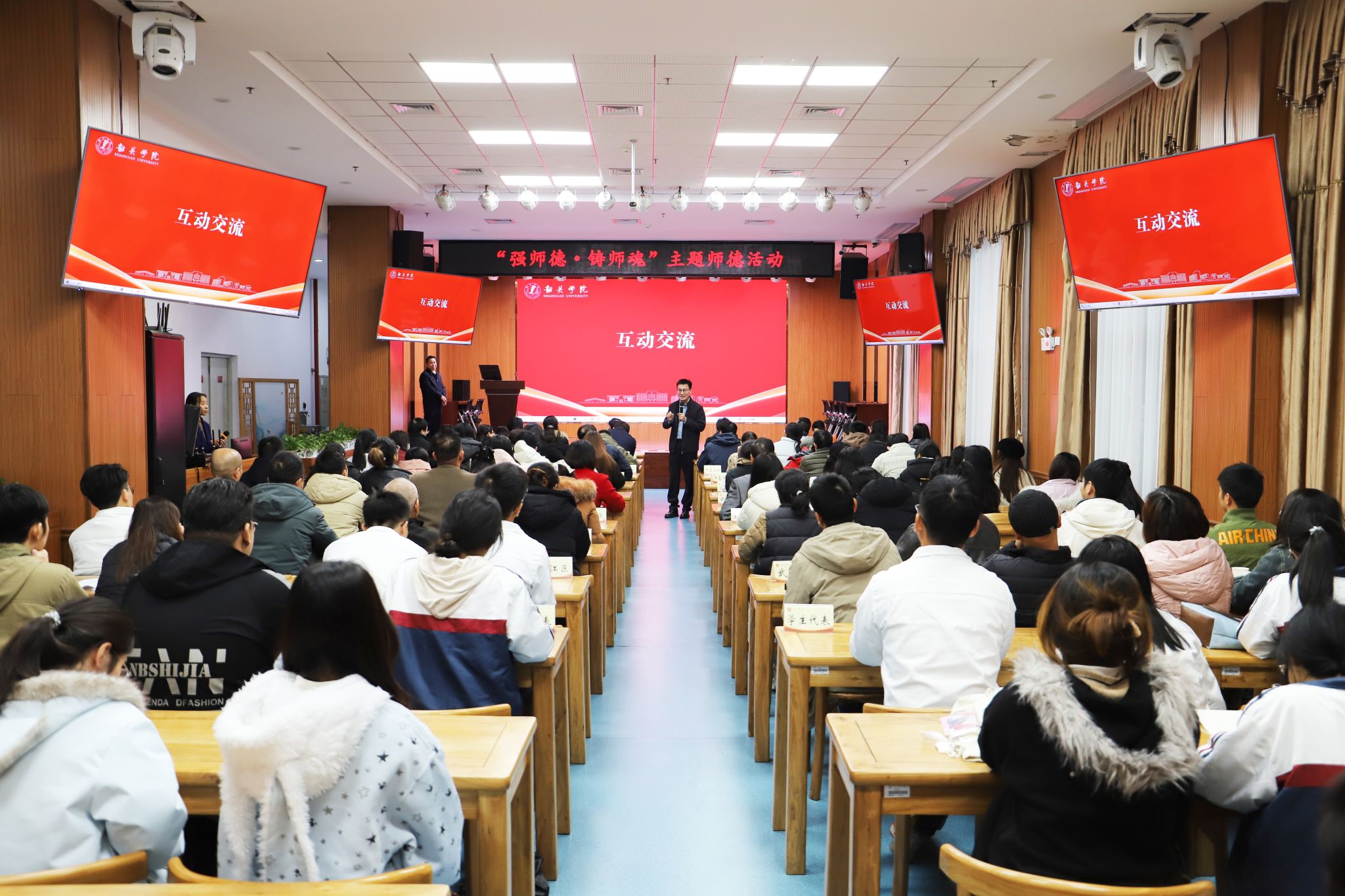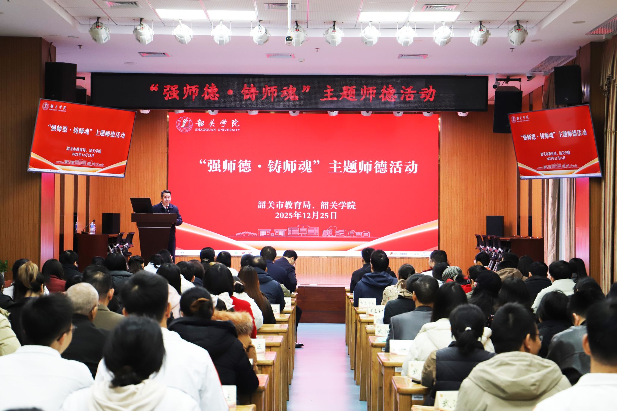 为引导广大职前职后教师弘扬教育家精神、厚植教育情怀,进一步推进学校纵向帮扶韶关市“三所学校”和县中质量提升工作,12月25日下午,由我校与韶关市教育局联合举办的“强师德·铸师魂”主题师德活动在我校明德区蔡志明楼一楼智慧课室顺利举行。我校党委副书记吴善添、韶关市教育局副局长刘小文出席本次活动。韶关市一线教师代表、我校优秀师范生代表共116人参加现场活动。活动由教育学部主任兼省级中小学教师发展中心常务副主任周思海主持。