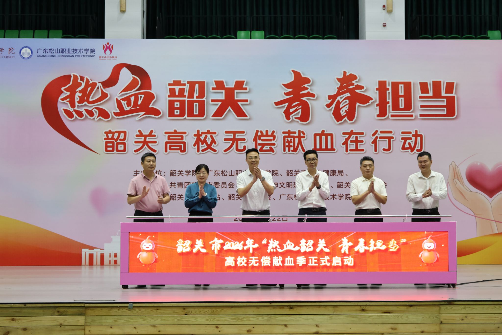 4月22日下午,韶关市2026年“热血韶关 青春担当”高校无偿献血季启动仪式在我校知行区体育馆举行。本次活动由韶关学院、广东松山职业技术学院、韶关市委宣传部、团市委、市中心血站、市红十字会等多单位联合主办,校团委与市中心血站承办,相关单位领导及我校师生代表、志愿者代表、优秀献血代表共300余人出席活动。