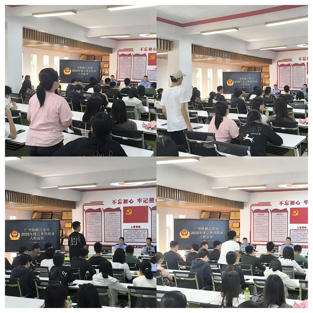 10月10日上午,广州铁路公安局2025年度公务员招录宣讲会在文学与传媒学院丹竹苑正式开讲。广州铁路公安处民警唐浩创、何光宇、陈泽鹏、罗坤,学院辅导员徐晶、钟全旺以及学校汉语言文学、法学、会计等专业的60余位同学参加了宣讲会。
