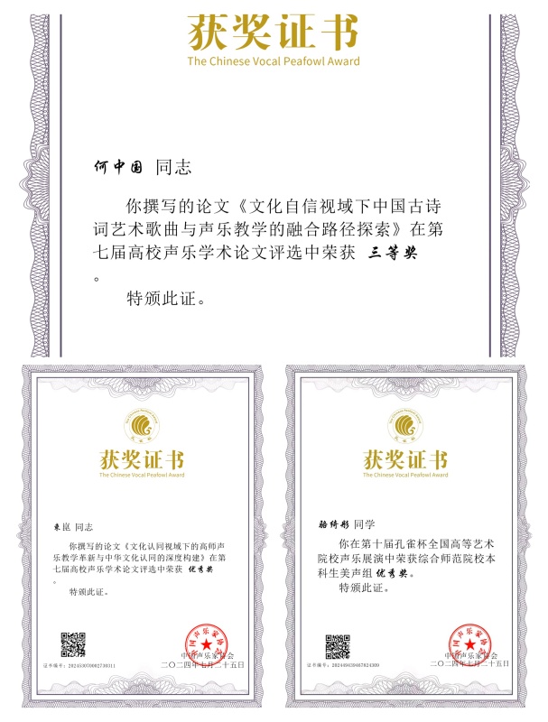 7月18日-7月25日,由中国声乐家协会主办的第十届“孔雀杯”高等艺术院校声乐展演暨第八届声乐学术交流活动在华南师范大学、华南理工大学、星海音乐学院举行,来自全国各地的声乐教育与研究领域的专家学者齐聚一堂,见证这一盛事。经过激烈角逐,我院师生获得佳绩,教师何中国与束崑在第七届高校声乐学术论文评选活动中分别荣获了三等奖和优秀奖。学生骆绮彤在声乐展演中获得综合师范院校本科生美声组优秀奖,其指导教师张思勉在孔雀之星——青年教师与研究生音乐会上精彩展示专业风采,获得好评。
