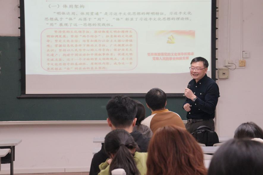周泽雄以“思想就是旗帜、旗帜引领方向”为主题,带领同学们从生成基础、体用架构、基本内容、精髓要义等方面深入学习领会习近平文化思想。周泽雄以“明体达用、体用贯通”为中心点,突出强调了习近平文化思想的理论性与实践性,倡导当代大学生要坚定文化自信、勇担文化传承创新使命。