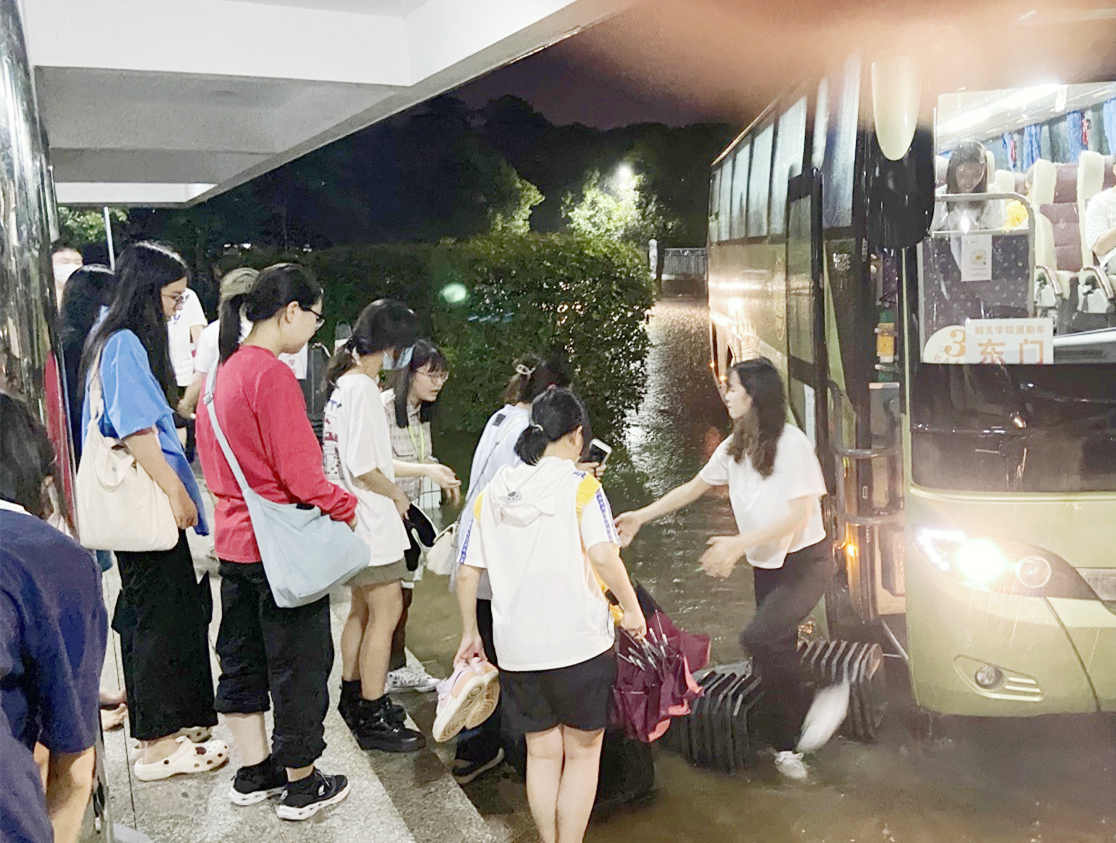 6月19日晚,学校在思源区体育馆通过校巴转移受困学生