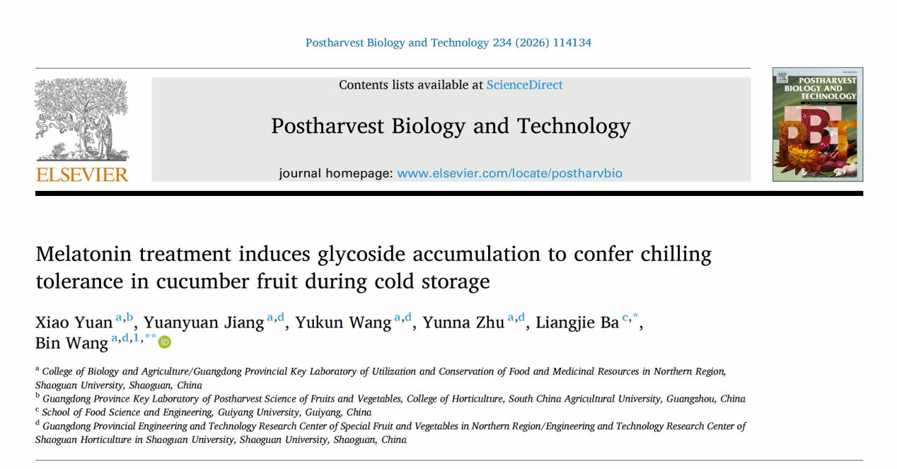 近日,生物与农业学院园艺系王斌副教授在采后果蔬生物学领域国际知名期刊Postharvest Biology and Technology(中国科学院1区Top,采后领域权威期刊),发表了题为“Melatonin treatment induces glycoside accumulation to confer chilling tolerance in cucumber fruit during cold storage”的研究论文。