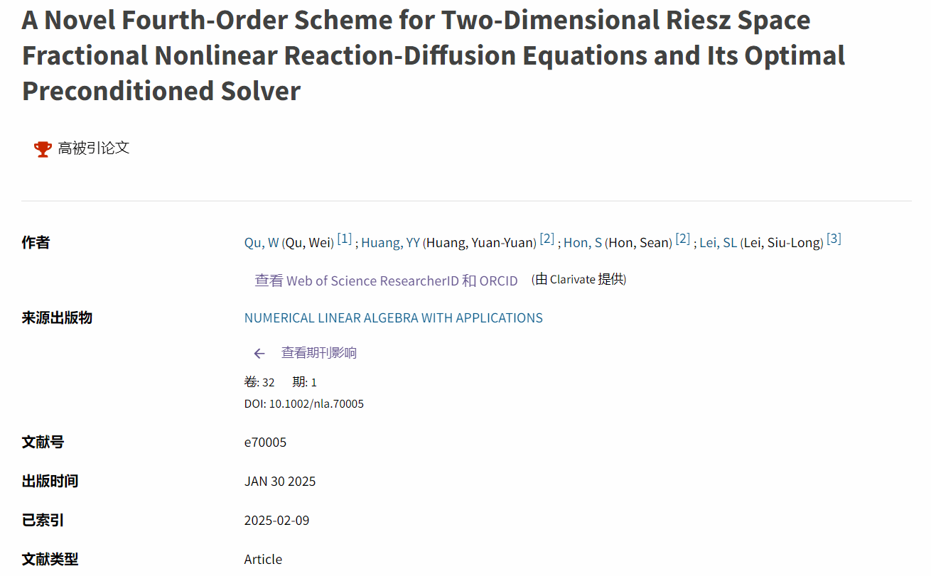 近日,Essential Science Indicators(ESI)数据库最新统计结果显示,我校数学与统计学院屈威老师以第一作者身份在国际学术期刊《Numerical Linear Algebra with Applications》发表的论文“A Novel Fourth-Order Scheme for Two-Dimensional Riesz Space Fractional Nonlinear Reaction-Diffusion Equations and Its Optimal Preconditioned Solver”入选数学领域 ESI 前 1% 高被引论文。该论文于2025年1月正式发表,在截至2025年12月的统计周期内共被引9次。论文合作者包括香港浸会大学黄园园博士后、韩汝星助理教授以及澳门大学李兆隆副教授。《Numerical Linear Algebra with Applications》是数值代数领域的重要学术期刊,影响因子为2.1,位列 JCR Q1,同时为中国数学会T2期刊和中国科学院三区期刊。