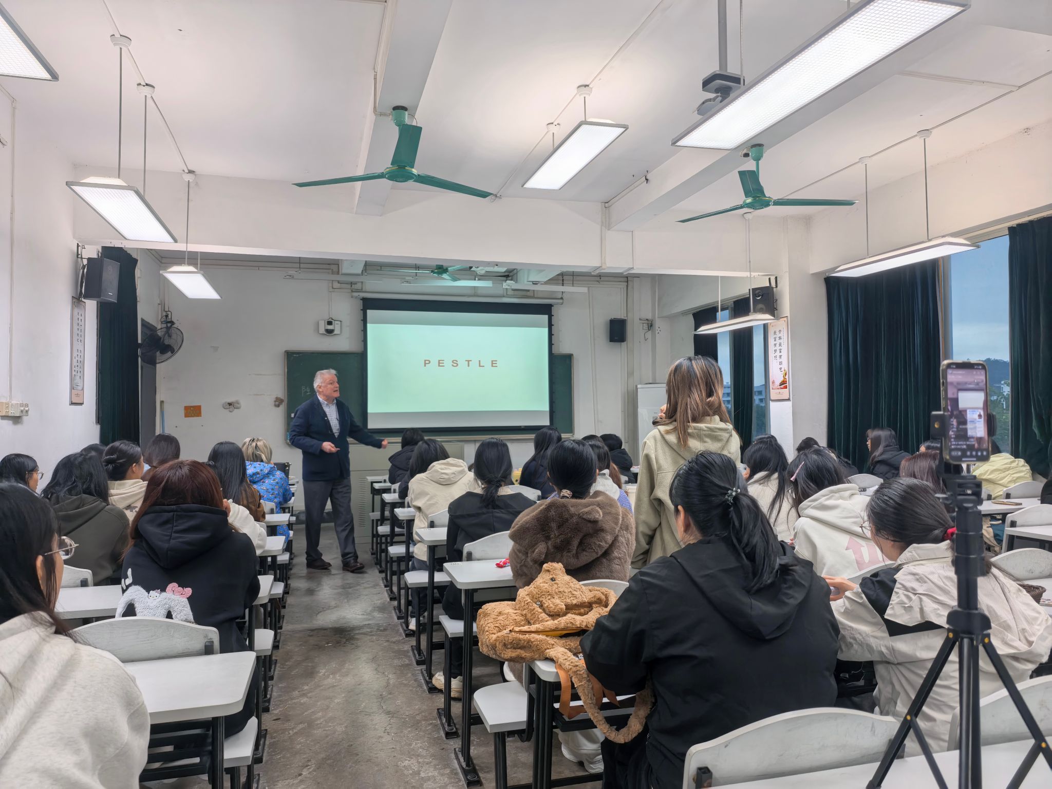 Adrian Pryce教授是战略管理、ESG(环境、社会及治理)与可持续发展领域的知名学者与实务专家,拥有逾三十年的国际商业咨询与高等教育经验。在为期三天的讲学中,他围绕“商业当代议题”“跨文化竞争力”以及“战略管理实践”三大核心主题,通过案例研讨、理论剖析与互动模拟,引导学生深入思考在瞬息万变的VUCA时代中,企业如何构建可持续的竞争优势。