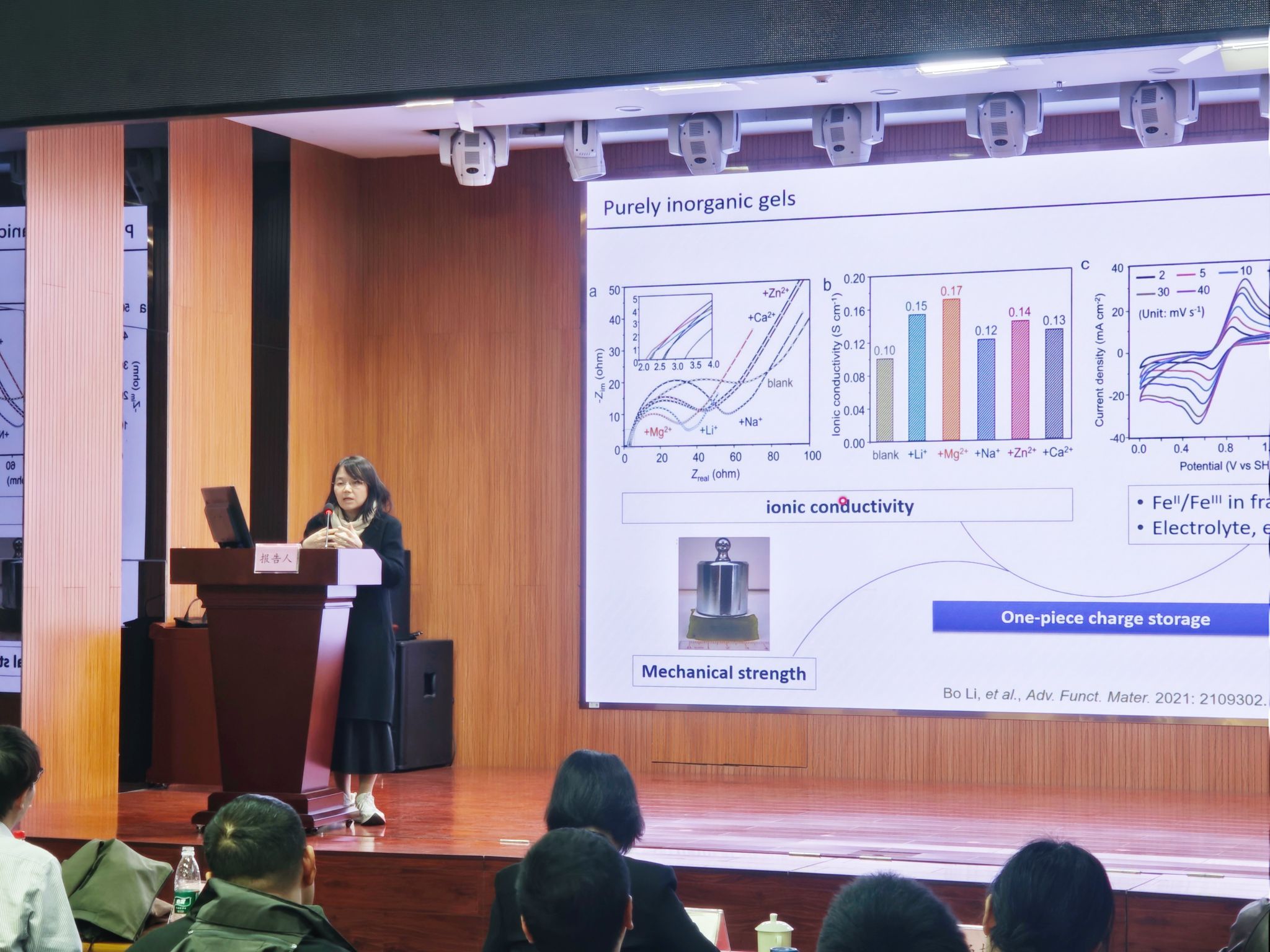李扬扬作了题为“矿物超凝胶:生物相容合成、一体化电荷存储及生物矿化/脱矿化机制”的精彩报告。该报告深入探讨了凝胶体系中生物矿物生长的研究进展,以及如何利用有机模板调控无机矿物的生长,从而制备出具有特殊结构和优异性能的有机/无机复合材料。她向与会师生展示了一种新型高熵、纯无机且具有高度生物相容性的矿物水凝胶。这种材料采用绿色、低成本的水基方法合成,本身兼具高离子电导率与内在氧化还原中心,为开发一体化高能量密度储能器件提供了新思路。李扬扬重点阐述了该类凝胶在生物矿化与脱矿化过程中的独特作用,其既可作为稳定的前驱体,也可作为中间腐蚀物质,在材料制备、成型、蚀刻及生物医学应用方面潜力巨大。她还分享了团队如何利用该材料探索一系列有趣的科学问题,如生物体内无定形矿物的稳定性机制、生命体系对生物陶瓷水合程度的调控、早期地球生命可能的栖息环境以及温和条件下矿物的融合与强化等。李扬扬的报告极具交叉性,巧妙融合材料科学、化学、生物学与地质学,激发了师生对跨学科研究的深入思考。