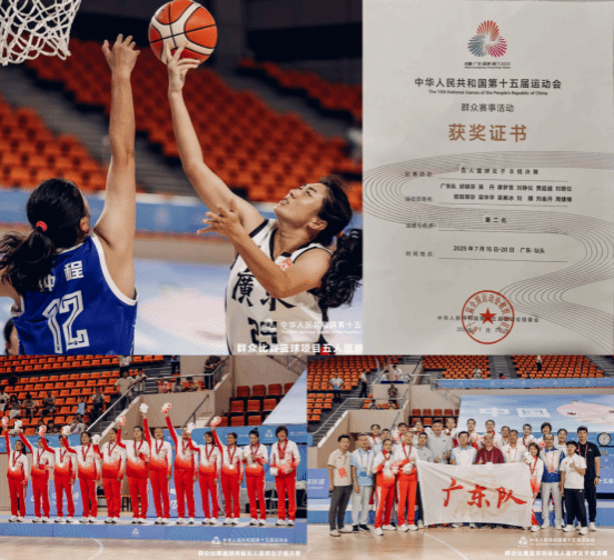 在近日结束的中华人民共和国第十五届运动会(以下简称“十五运会”)群众组篮球比赛中,我校体育学院刘娜老师作为广东省代表队成员,凭借出色的竞技水平和顽强的拼搏精神,在十五运会比赛中脱颖而出,勇夺群众篮球项目五人篮球女子B组第二名,为广东省和我校赢得了荣誉。