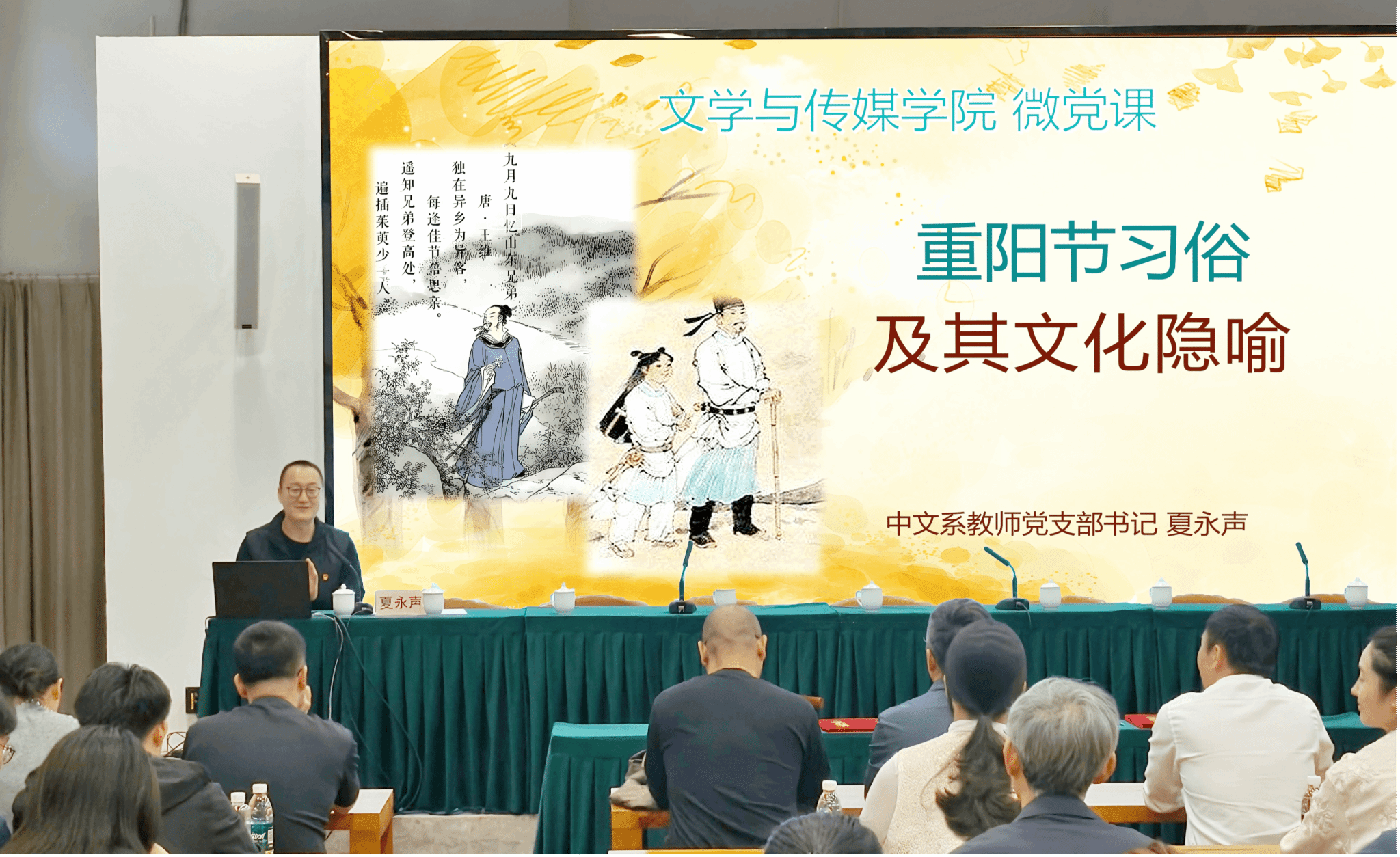 中文系教师党支部书记夏永声从重阳节登高、插茱萸、赏菊等传统习俗切入,深入剖析其背后蕴含的文化内涵,为在场人员呈现了一堂兼具文化厚度与思想深度的精彩党课。党课后,学院领导带领师生党员代表携带米面粮等慰问品,走进冲下村老党员家中开展入户走访,关切询问老人家身体状况和生活起居,认真倾听他们的奋斗故事与心声,并送上节日慰问品和诚挚祝福。
