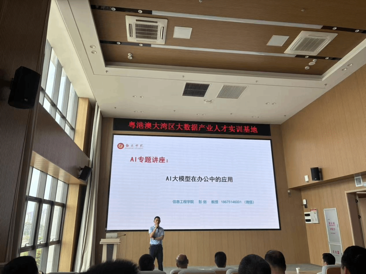 为深入贯彻党的二十届四中全会精神,落实“双百行动”工作目标任务,推动校地协同赋能高质量发展,4月10日上午,应中共南雄市委党校邀请,信息工程学院彭剑教授赴粤港澳大湾区数据应用产业园,为南雄市58名乡科级领导干部作“AI大模型在办公中的应用”专题辅导。