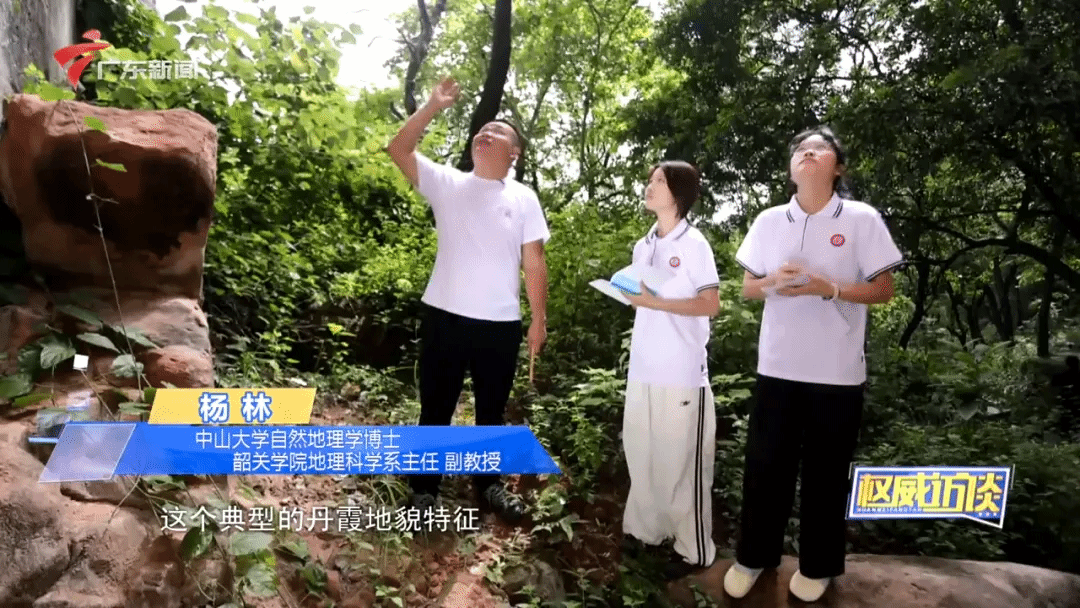 为完美呈现节目主题,杨林老师进行了精心筹备,不仅深入梳理相关历史脉络,更是亲自带领学生赴坪石金鸡岭进行野外考察。在拍摄现场,杨林老师凭借深厚的专业基础和丰富的教学经验,深入浅出地讲解了丹霞地貌的典型特征,让同学们和观众对丹霞地貌有了直观深刻的认识。