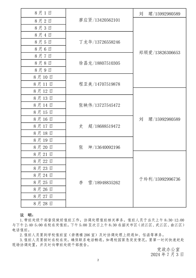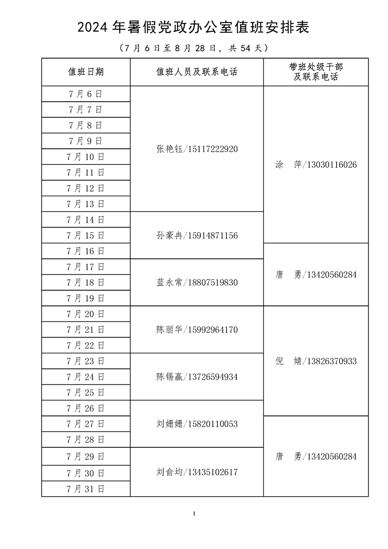 2024年暑假党政办公室值班安排表